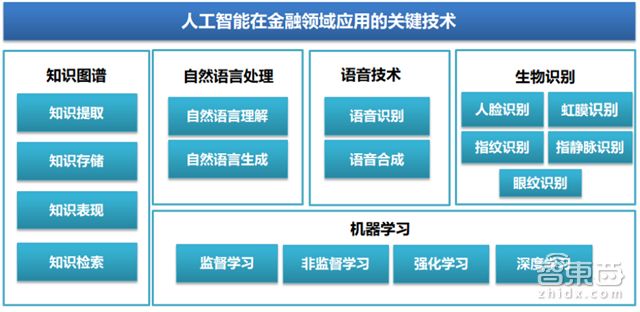 在金融领域应用中,人工智能主要包括五个关键技术:机器学习、生物识别、自然语言处理、语音技术以及知识图谱。目前,人工智能技术在金融领域应用的范围主要集中在智能客服、智能投顾、智能风控、智能投研、智能营销等方面。