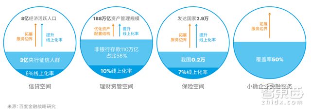 与从同时,我国金融市场潜力巨大:8亿经济活跃人口,有央行征信记录人群仅3亿,尚有5亿人未被覆盖到,信贷线上化率仅6%。188万亿资产管理规模,非银行存款占58%,资产配置优化空间巨大,而线上化率仅10%。