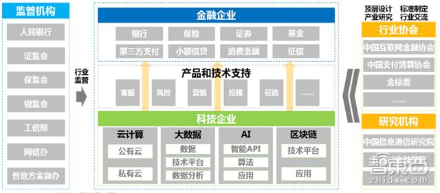 我国金融科技产业生态体系主要由金融企业、科技企业、金融监管机构、行业协会和研究机构组成。其中,金融企业主要是运用科技企业提供的“ABCD”等先进技术,提供创新金融服务,监管机构主要是依据国家相关政策法规对金融企业进行合规监管,行业协会和研究机构主要是进行研究,推动行业交流和标准制定。