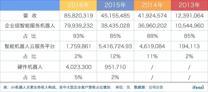 中大型客户是小i机器人的核心客群。在三大重点业务中,面向中大型企业客户的企业级智能服务机器人收入占比持续提升, 2016年上升为93%,是营收增长的核心动力。