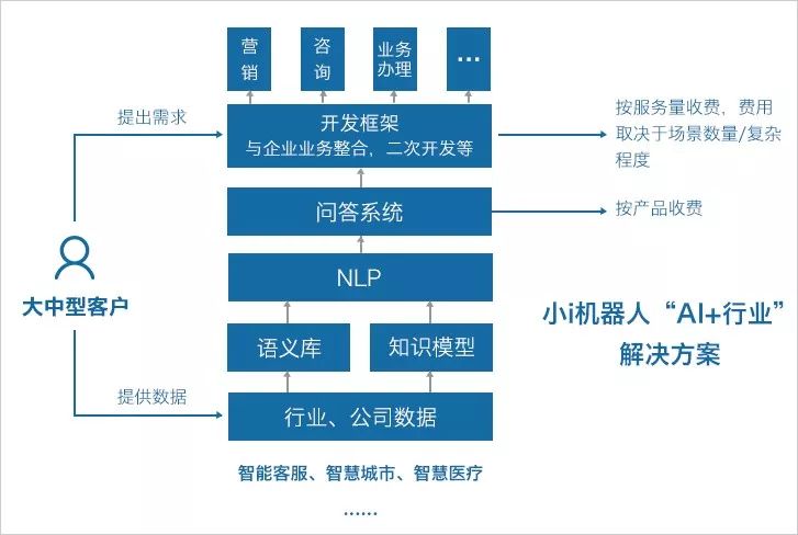 而随着AI技术的完善以及在各领域应用的加深,小i机器人业务也在进行调整,在智能客服之外,将目光放到更广阔领域,定位于提供“AI+行业”解决方案,进入到智慧城市、智慧医疗、智慧金融、智能办公、智慧生活、智能制造等领域,在AI商业化上走的更远。