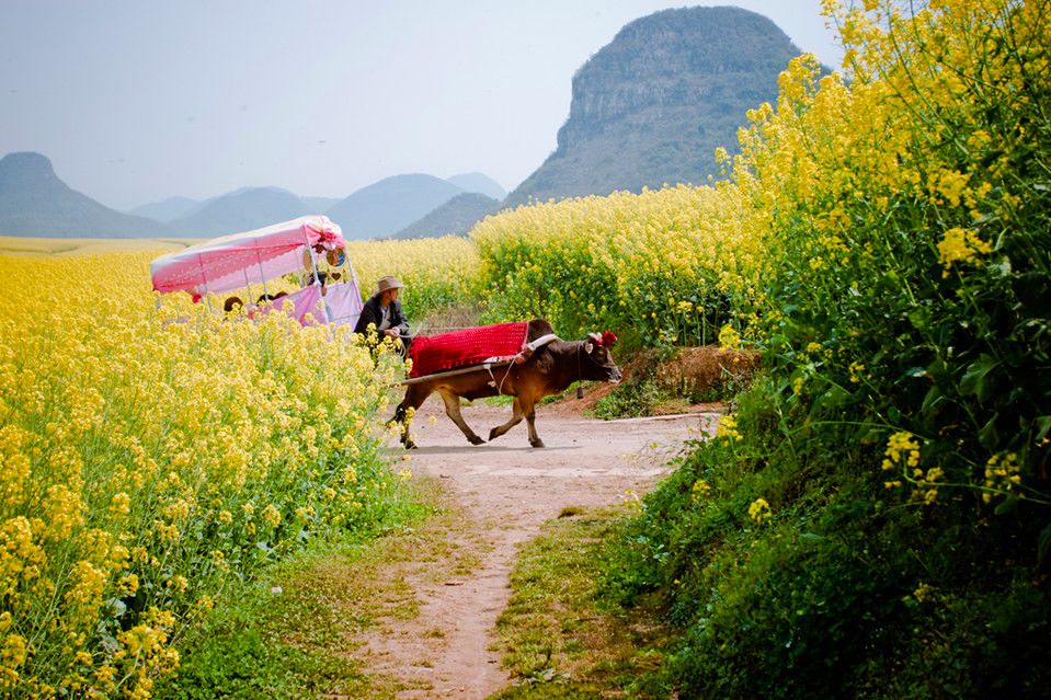 来到罗平,怎么能不坐一次牛车。水牛在当地人的牵引下,慢悠悠地行走在油菜花田之中,坐在牛车之上,颠簸之中,嗅闻着迷蒙的花香,看着一望无垠的金黄中矗立着一丘丘山包,似乎是青春少女怀着希望向我们款款走来。