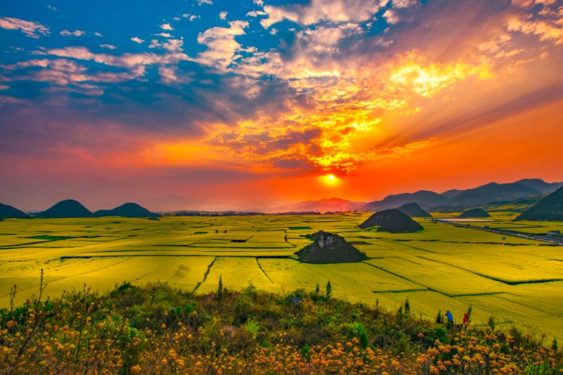 金鸡峰丛曾被《中国国家地理》评为“中国最美峰丛”,所以也毫无疑问成为了罗平公认的NO.1的油菜花观赏地。放眼望去,一座座孤峰林立在油菜花田之中,宛如刚出土的春笋。这里还是最适合拍日出日落的地方,朝夕晚霞映射在金色的海洋与峰丛之间,更加鲜亮迷人。