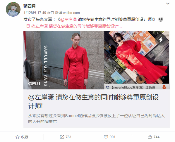 1月28日,新浪微博用户“粥四月”发布文章,指出网络红人“左岸潇”在2017年12月推出的一款红色鱼尾连衣裙抄袭了中国独立设计师杨桂东去年2月发布的作品。文中对两条裙子的款式做了对比,指出除了袖子长短、开襟处设计和领口高低有细微差别外,整条裙子“几乎一模一样”。该文还特别拿出左岸潇在去年10月购买原版的事例,作为抄袭的“实锤”。