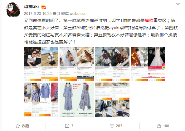 网上早有人吐槽这类“一个愿打一个愿挨”的消费现象,且伴随着大批量生产造成的质量问题,一些揭露网红店问题的博主开始涌现。这其中,较有威望的是微博用户“母神ski”。拥有近50万粉丝的她已经在微博上和网红服装店“战斗”多年。通常针对质量、款式和运营等方面带动网友讨论交流,并指出过许多问题。从她的微博中不难发现,网红服装店的普遍问题是抄袭。不少店铺还出现一起抄的撞款问题。这一方面与供货工厂、网红孵化器统一供货有关。另一面网红们的“选款品味”也总是差不多。