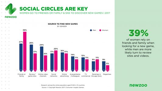 NewZoo发表的《男性与女性玩家的异同如何塑造游戏市场》报告也证实了这样的观点。39%的女性是通过朋友和家人发现新游戏的,相较于男性的27%高了12个百分点,20%的女性也会通过社交来发现新游戏,也就是我们说的朋友圈和微博平台。而这个数据是针对全球的,中国玩家范围内的差异可能更明显。男性玩家更主动去观测KOL和分析网站发布的内容,来判断一款新游戏是不是值得玩。