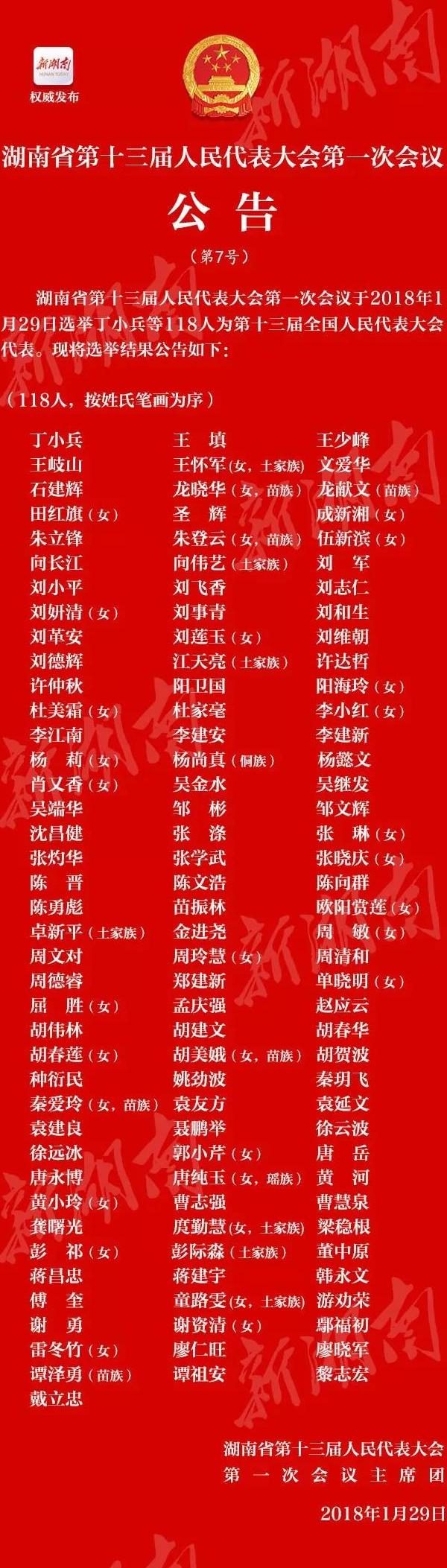 刚刚 ,湖南选举产生118名第十三届全国人民代表大会代表。