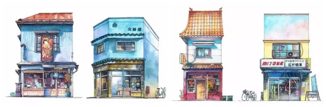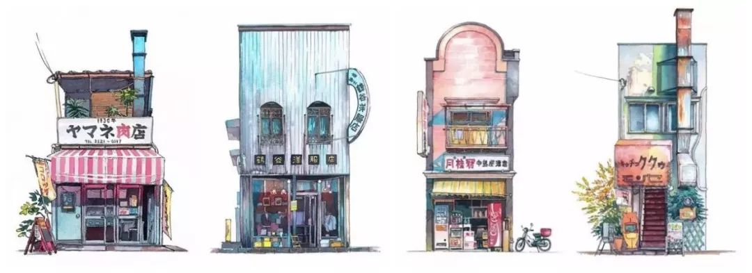 从左至右依次为:Isetatsu木板印刷店(Yanaka)/大田屋肉店(曲町)/吃茶楼(高田马场)/Miyake自行车店(Kagurazaka and Kichijoji)