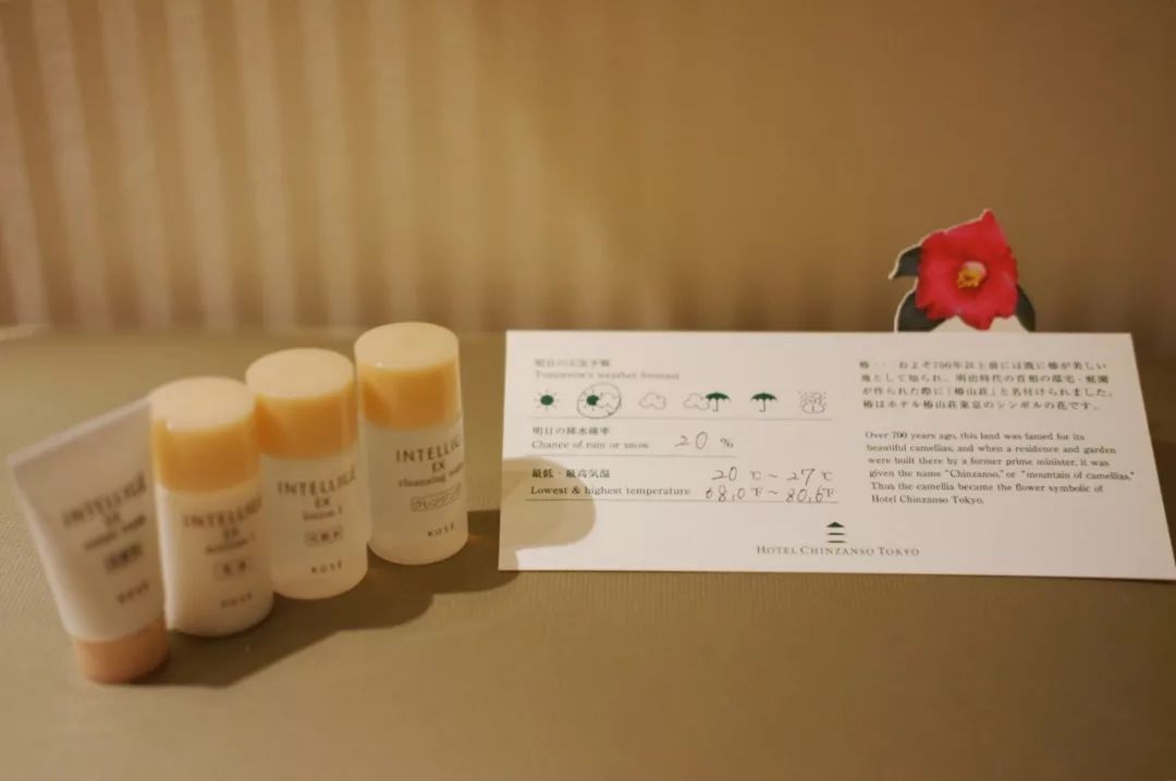 房内还有不少细节特别暖心,比如温馨提示天气和温度的卡片,以及旅行装的资生堂护肤品,包含水乳、卸妆水和洗面奶。