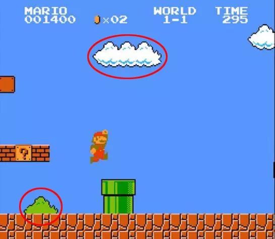 在游戏中登场的蘑菇、向日葵、星星等道具,为了节约容量,这些道具的像素图都只画一半,然后经过水平反转后,才组合成了玩家所看到的样子(左右对称,万岁!)。此外,还有着为乌龟添上像素翅膀变成新的敌人,背景中的云和地上的草其实形状相同,只是换了颜色而已等“奇策”,其“抠门”的程度真是闻者伤心见者流泪。