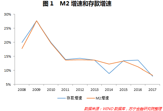 存款的减少,可以从M2的角度来解释,银行是货币派生的主体,存款派生的结果最终反映到M2上。自2007年以来,M2增速持续下降,2017年末M2增速仅有8.2%,同期银行一般性存款增速为7.8%,均创了近十年来的新低(参见图1)。