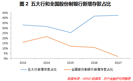 从结构上看,存款在不同银行之间分布愈加不均衡,并呈现出向大行集中的趋势,中小银行吸收存款难度加大。2017年9月末,五大行新增存款4.97万亿元,占当期银行业新增存款的42.56%,同期,全国股份制银行新增存款仅0.22万亿元,仅占当期新增存款的1.87%(参见图2)。存款向大行倾斜明显,特别是具有网点优势的工行以及深耕县域的农行,近年存款增速仍保持在8%以上,高于行业均值7.83%的增速水平。