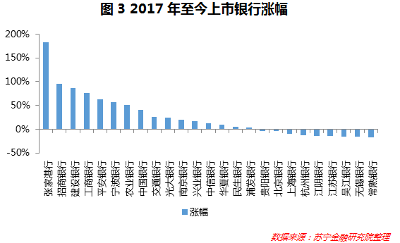 事实上,资本市场中,各家上市银行股价的涨幅也说明了问题。2017年至今,除了上市不久的张家港行(2017年上市),其他上市银行中,涨幅超过50%的分别是招商银行、建行、工行、平安银行、宁波银行和农行(参见图3),其中,国有大行的存款获取具有明显优势;招商银行深耕零售业务十余年,一般性存款增速稳定,资金成本优势明显;平安银行近年加快零售业务转型,非息业务收入占比已经超过30%。