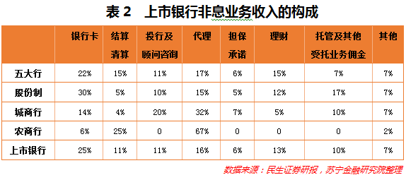 另一方面,调整营收结构,提高非息收入占比。目前银行业的非息收入主要来源于中间业务与表外业务,具体包括支付结算类业务、银行卡业务、代理类业务、托管类业务、投资银行业务、咨询顾问类业务等,银行从中收取手续费或佣金收入。其中,银行卡、代理业务及理财业务收入占比居于前列。从此前民生证券的研究报告中可以看到(参见表2),上市银行中,银行卡、代理、理财业务占中间业务收入的比重分别为25%、16%和13%,所以,零售银行也因此成为各家银行大力布局的重要领域。