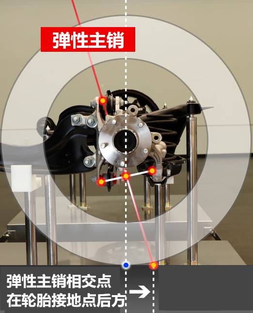 如果将后悬挂的弹性主销设计在轮胎接地点后方,那么后轮其实就是绕着弹性主销旋转,在转弯时后轮的滑移角度就会增加。