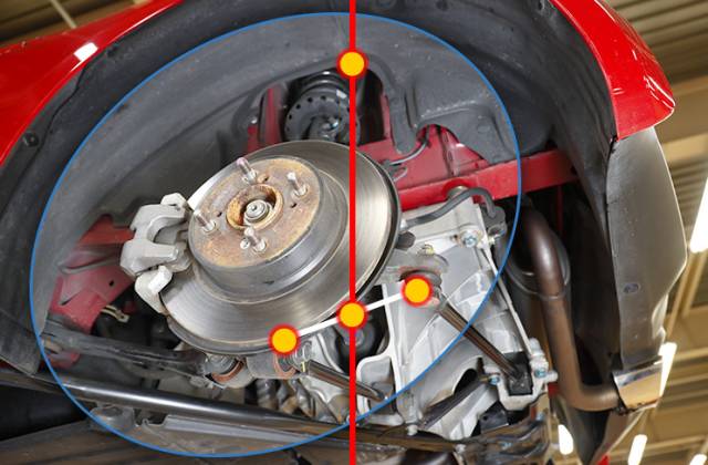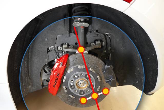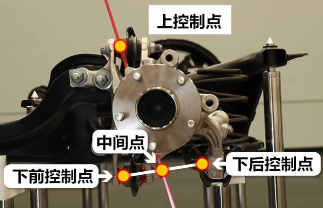 通过调整后轮悬挂上控制臂 和 下控制臂的位置就能改变弹性主销的角度。本田工程师也透漏了一个测出后悬挂 弹性主销 的方法。首先找到上下控制臂的支点,随后把下控制支点连在一起,将上控制臂或者主销点连接到下控制臂连线中间点,这样就得出了 弹性主销 的位置。