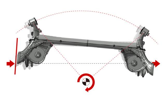 所以工程师就从扭力梁悬挂衬套动手,把扭力梁的与车身连接点设计成斜的,并且允许其一定角度变化,这就让后悬挂的旋转中心在输入点(车轮)的后面,转向时悬挂角度细微变化而轮胎角度也随之变化,后轮转向就这样在扭力梁上实现了。这种设计对衬套的纵向刚度 舒适性 后运动特性之间做大量研究和权衡,这使得扭力梁的设计比双叉臂 多连杆 更难。