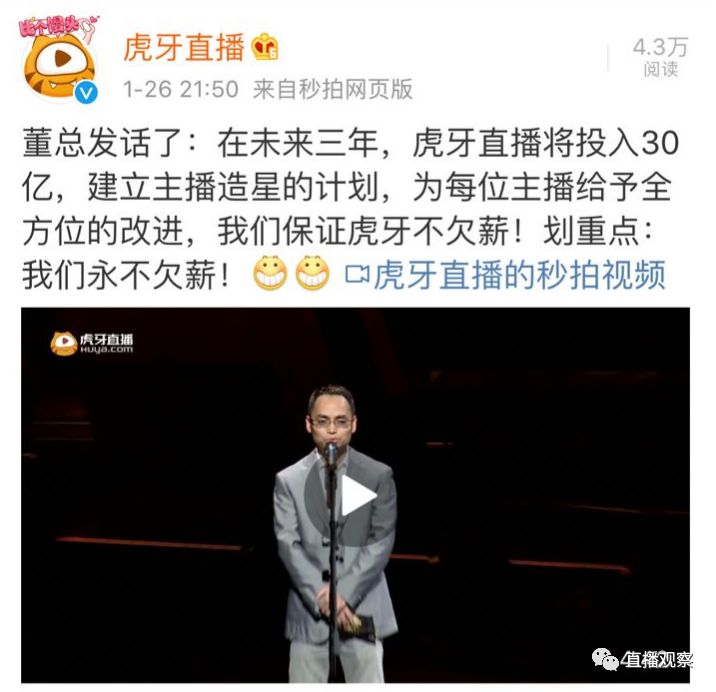 26日晚21:50分,虎牙直播CEO董荣杰发表演讲,其中重点强调“我们保证虎牙不欠薪!划重点:我们永远不欠薪!”。