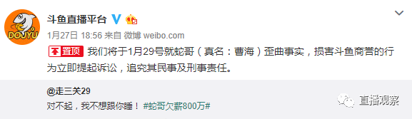 27日18:56,斗鱼将于1月29号就蛇哥(真名:曹海)歪曲事实,损害斗鱼商誉的行为立即提起诉讼,追究其民事及刑事责任。