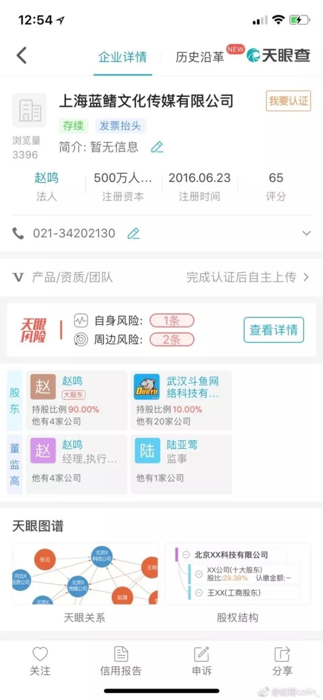 蛇哥这篇微博曝出的是:卢本伟女友赵梦玥的父亲(赵鸣)和斗鱼开的这家公司——上海蓝鳍文化传媒有限公司。