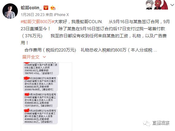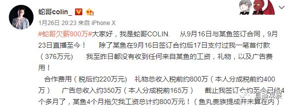 26日晚20:23,蛇哥发布“#蛇哥欠薪800万#”为话题的微博,微博重点内容如下: