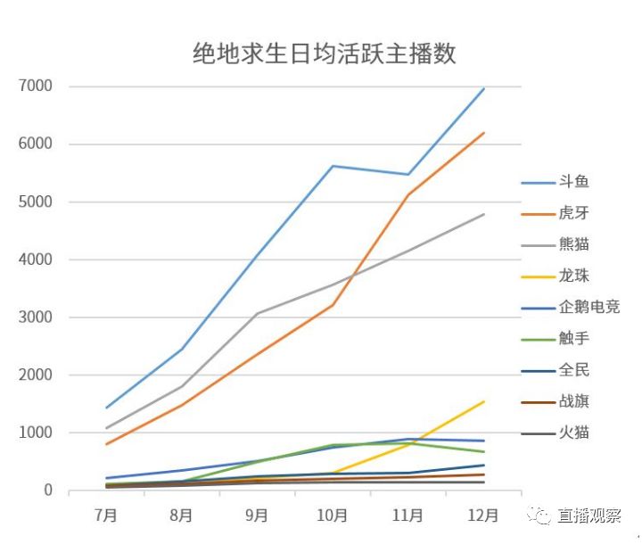 目前来看,明星主播主导用户流量争夺战,从今年下半年A+跳槽YY开始,吃鸡主播争夺大战已经爆发,截至到目前为止,虎牙是吸收最多绝地求生主播的平台,吸纳的吃鸡主播有:韦神、Sy是个萌妹、404NotFound、陈子豪等,继续吸收吃鸡主播将会是未来直播平台的大趋势。