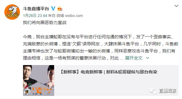 26日晚23:44,斗鱼发布:蛇哥背信弃义微博,微博重点内容如下:斗鱼蛇哥不断变更合同,导致斗鱼在12月25日连发给蛇哥4个月工资(蛇哥月直播工资43.8万),我们将向黑恶势力宣战。
