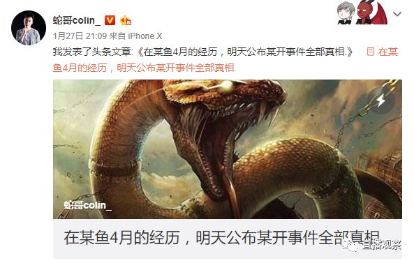“...要搞斗鱼!从我身体上踏过去!钢板蛇!”这是原斗鱼蛇哥在2017年12月18日在微博上说的。当时直观君就很佩服这个人,正面刚,有血性。1月26日晚,血性蛇哥的一条微博:蛇哥欠薪800万,则送他上了头条。