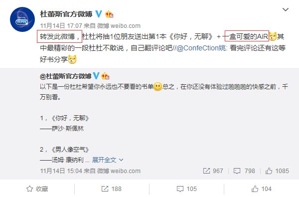 杜蕾斯自然也利用了这一点,时不时的以“转发微博”的形式进行抽奖,奖品多是杜蕾斯自己的产品——既给粉丝发放了福利,吸引更多的参与,同时也给自己的产品做了一次宣传。