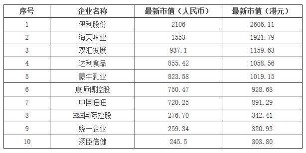 如果以港元为单位计算,伊利、海天味业、达利和蒙牛都已突破千亿港元市值,而双汇也以折算成1159.63亿港元的市值成为另一个千亿市值企业,也就是说,市值达千亿港元的食企已有伊利、海天味业、双汇、达利和蒙牛五家。