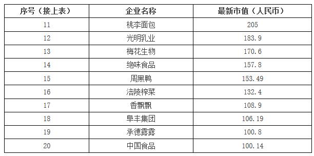 以下食品企业市值也突破了百亿人民币: