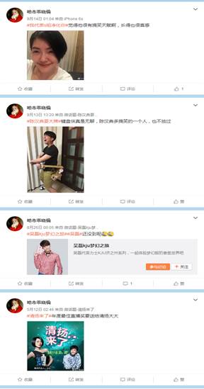 从2014年到2017年,发微博2674条, 5条原创,其中2条有1个点赞数据。5条原创,每条都带有话题,没有任何评论。内容如下: