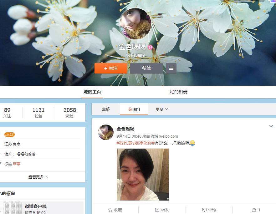 我们再来看看,筛选10条评论的,来第三位粉丝@金色喝喝,是不是惊呆了?依旧是#我代表S姐净化你#的话题,和同样的照片,而且3人的发布时间都是同一天。