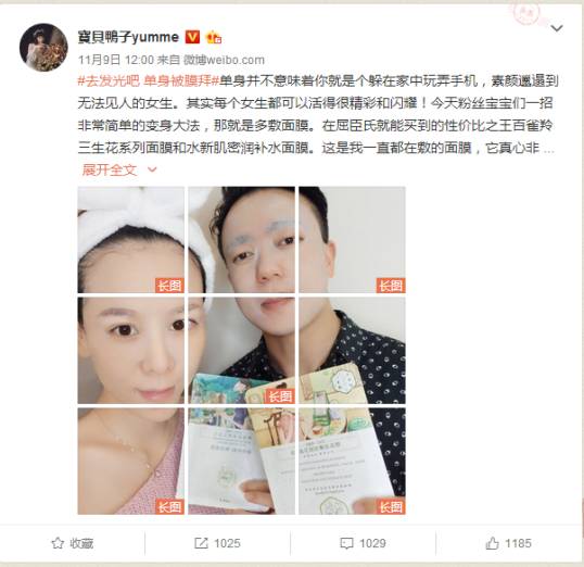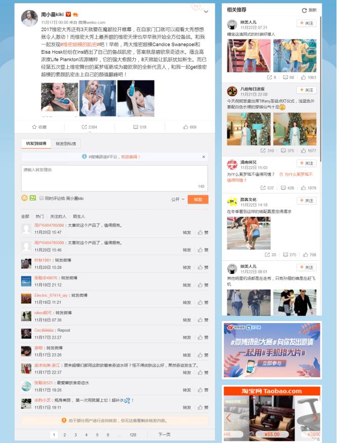 首先,我在她的原创微博中随机选取最近的一条,从这条关于化妆品的推广说起。呃~转发2384、评论518、点赞699,表面上看数据很棒,商家应该很很满意吧!