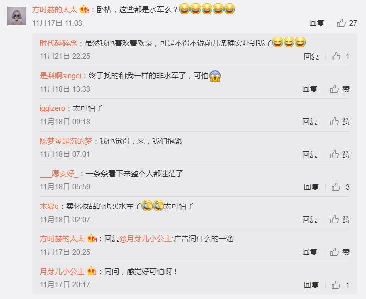 随意从@寶貝鴨子yumme中抽出一条微博,随意截取10条评论,这10条紧挨着的评论背后,竟然是如此惊人的一致。细思极恐!