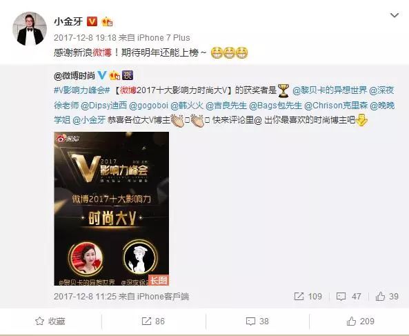 但诡异的是,微博时尚2017十大影响力时尚大V中,小金牙与黎贝卡、gogoboi同获殊荣。这榜单的公信力也是醉了,前面9个我都知道,只是小金牙的数据,实在让我哭笑不得。