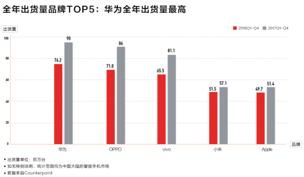 华为、OPPO、vivo国内出货量增长明显,分别达9000万、8600万和8110万台,小米和苹果相比2016年小幅增长,分别达5710万台和5140万台。