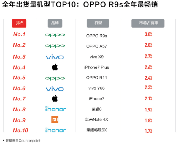 全年量产机型TOP 10中,OPPO占据了三款,其中OPPO R9s单款市场占有率就达3%,以2017年中国手机市场整体出货量4.726亿台计算来看,单款出货量已超过1400万台,成为真正的“旗舰爆款”机型。vivo、苹果、荣耀分别有两款机型进入TOP 10,同样有当年主打旗舰机型入选。小米则有一款红米Note 4X进入TOP10,其旗舰机型相比OPPO、vivo、苹果和荣耀缺乏真正的“爆款”产品。