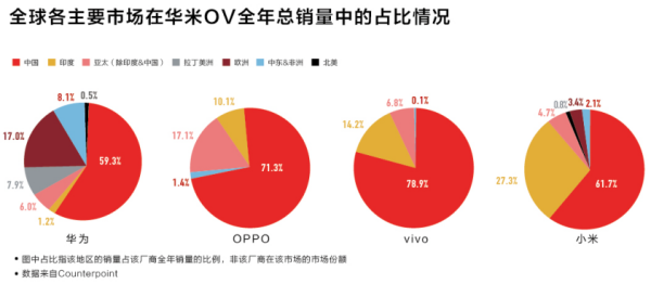 《2017年手机行业白皮书》数据显示,小米是2017年海外出货量增长最快的中国手机品牌。从全球各主要市场来看,华为国际化程度最高,中国市场占比59.3%,欧洲市场占比17%;小米中国市场占比61.7%,印度市场占比27.3%;OPPO中国市场占比71.3%,亚太市场占比17.1%,印度占比10.1%;vivo中国市场占比78.9%,印度市场占比14.2%。总体来看,华为海外市场更偏重欧洲、中东和拉美,相对比较均衡,小米海外主要依靠印度,OPPO和vivo更依赖中国市场,vivo相比而言更偏重印度,而OPPO在亚太市场更具优势。