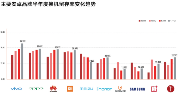 今日头条公布的数据显示,只有vivo、OPPO、华为、荣耀四家品牌在过去两年中保持了用户换机存留率(品牌忠诚度)的正向增长,小米、金立、三星、一加的用户品牌忠诚度都在2016年出现下滑,魅族则是2016-2017连续两年出现下滑。其中有三家品牌忠诚度超过30%,分别为vivo(35.71%)、OPPO(33.45%)和华为(32.64%)。