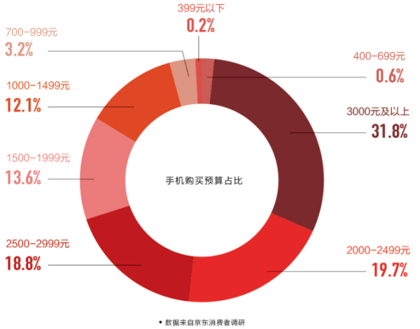 《2017年手机行业白皮书》数据显示,70%的用户购机预算超过2000元,3000元以上占比接近32%,1000元以内近为3.4%,表明换机用户预算充足,价格已不是影响用户购机的主要因素,对于手机企业推出的产品和体验要求更高。