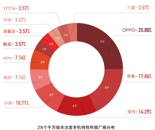 根据今日头条数据统计,2017年共有11家厂商的28个手机特性/功能点的用户关注度超过1000万。其中关注度最高的是华为-徕卡双摄的合作,用户关注度接近800万,表明与知名专业品牌和合作带来的“聚焦效应”非常突出。OPPO则在28个手机特性点中独占7个,包括VOOC闪充、微缝天线、星幕屏、巴萨定制版、定制IMX398摄像头、月牙弯、娇兰热力红定制版,显示出OPPO对手机特性/功能点的包装能力在所有手机厂商中首屈一指,OPPO显然相比其他厂商更懂得如何影响年轻用户,购买转化率更为成功。