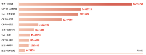 跨界营销也是2017年手机厂商的重要差异化突破点。华为和保时捷的合作是2017年最受关注的跨界营销案例,用户关注度接近1.5亿。OPPO、vivo和腾讯王者荣耀的合作紧随其后,也都创造了超过7000万的用户关注度。2017年OPPO、vivo都进行了大量跨界合作,关注度均较为可观。