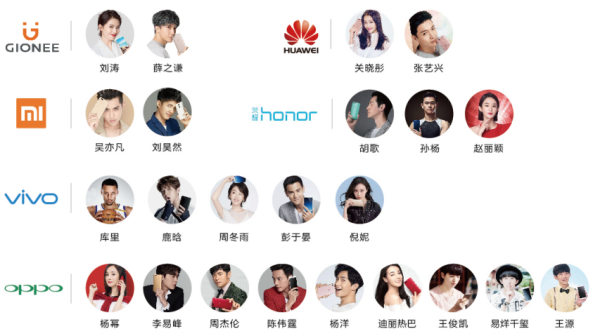 2017年中国手机市场,12家主流手机厂商中,共有6家厂商选用了23位代言人,前三位分别是OPPO(9位)、vivo(5位)、华为+荣耀(5位)。