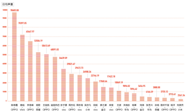 阅读声量方面,陈伟霆+OPPO、鹿晗+vivo、李易峰+OPPO、胡歌+荣耀、王俊凯+OPPO,给手机厂商带来的资讯阅读量最大,品牌曝光流量效果最好。其中陈伟霆在今日头条上日均能为OPPO带来近10万次阅读,并且相比其他代言人阅读声量优势非常明显。