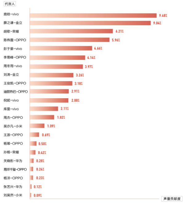 而鹿晗代言带来的声量比最高:鹿晗与vivo同时出现在今日头条资讯的阅读量,占到了vivo所有资讯阅读总量的9%以上。紧随其后的是薛之谦+金立(9.04%)、胡歌+荣耀(6.21%)、陈伟霆+OPPO(5.96%)和彭于晏+vivo(4.66%)。