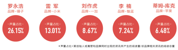来自今日头条用户阅读数据显示,手机企业高管产生的“声量比”(高管和品牌同时出现对阅读产生的拉动作用)前五位分别是罗永浩-锤子(26.15%)、雷军-小米(13.01%)、刘作虎-一加(8.67%)、李楠-魅蓝(7.24%)、库克-苹果(6.48%)。