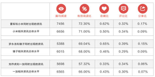 雷军和小米同时出现的资讯,除评论小幅下滑外,其他阅读指标均好于小米自身品牌资讯的总体水平。而罗永浩和锤子同时出现的资讯内容,篇均阅读量会有明显下降,其他提升用户转化率的阅读指标(收藏比、评论比、分享比)都有明显提升。而刘作虎和一加同时持续的资讯,跟一加相关资讯的总体水平相比,除了评论略有上升外,其余阅读指标均有下滑。