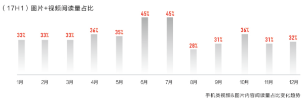 视频内容曾被作为2017年的“风口”。但从今日头条实际数据来看,视频+图片的内容阅读量在全部手机类资讯中的比重在2017年7月达到顶峰(45%),随后逐渐回落至40%左右的水平,并没有外界预估的“超过50%”。