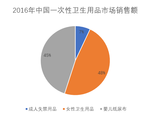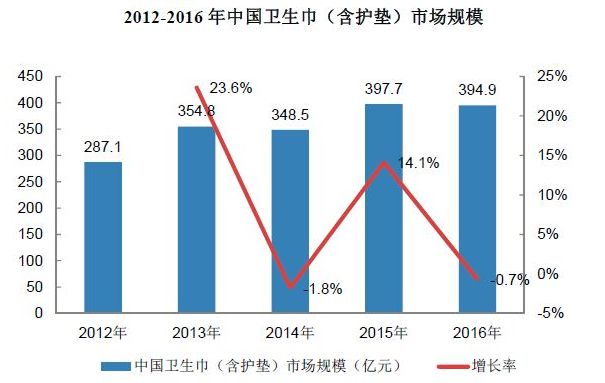 2016年我国一次性卫生用品市场总规模达到829.4亿元,比2015年增长3.6%。其中,女性卫生巾(含护垫)以48%成为占比最高的品类。